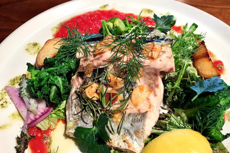 とれたての鮮魚にカラフルな鎌倉野菜をふんだんにあしらった「地魚のカルパッチョ」はシェフの特製ソースが素材の良さをいっそう引き立てる逸品。お店の薪窯でこんがり焼き上げるピッツァにも、湘南名物の釜揚げしらすや小坪産サザエが登場する、まさに小坪の海辺イタリアン。メインディッシュでは地元ならではの新鮮魚を使った「本日の魚の香草焼き」もおすすめです。