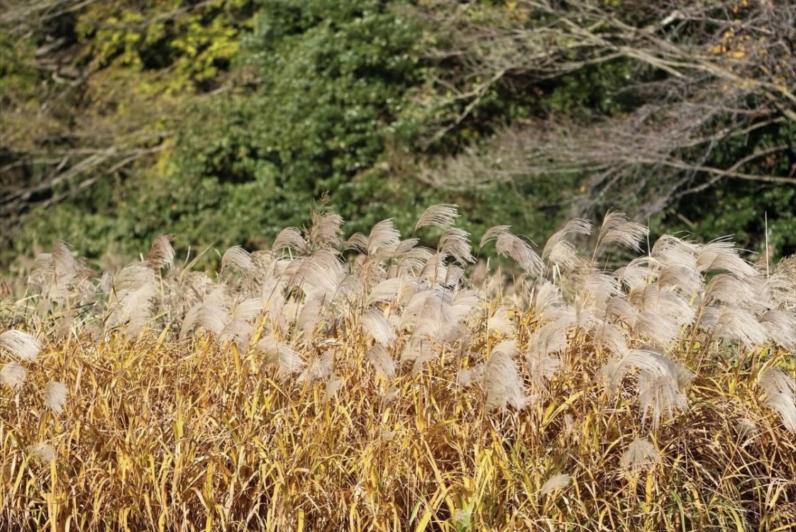 池子の森自然公園緑地エリアの沼に葦とススキが生い茂っていました。