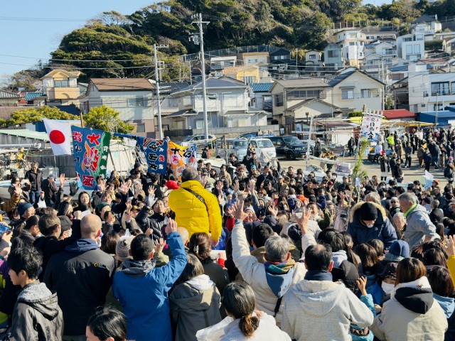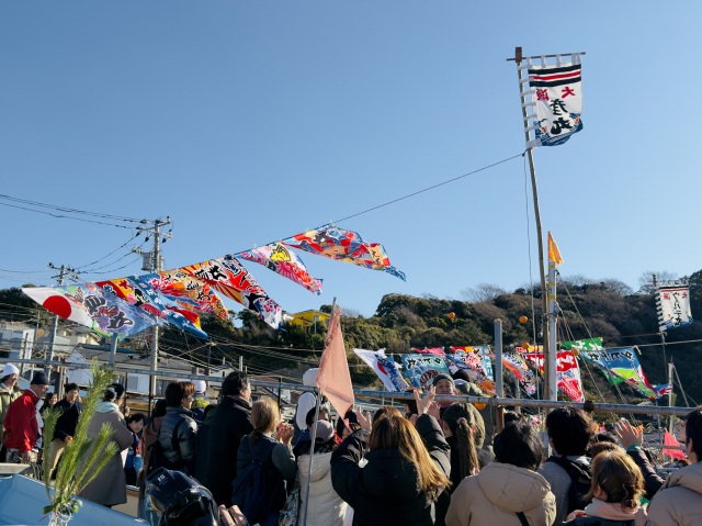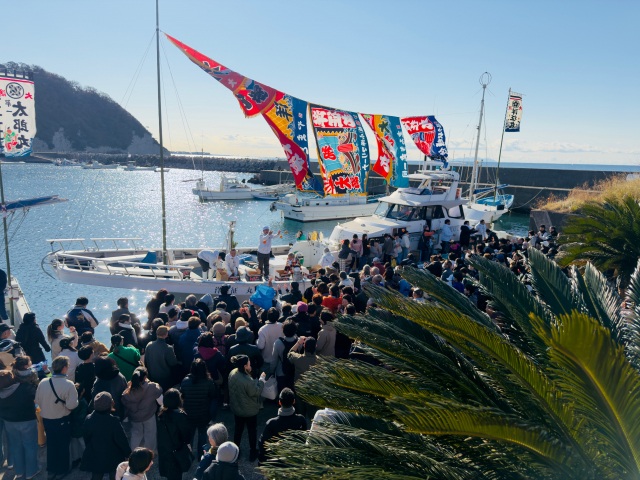 小坪漁港の伝統行事。大漁旗たなびく漁船から投げられる「みかん」は厄除けと幸運を呼ぶといわれています。