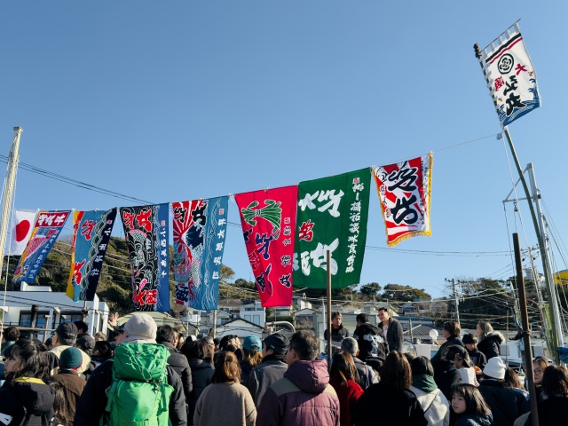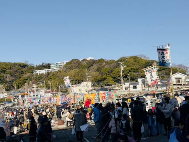 八大龍王社の祭事の一つとして、一年の豊漁と海上での安全を願って龍宮様に奉納したみかんを投げる行事です。漁師たちは9時から1年の豊漁と海上での安全を願って龍宮にみかんを奉納します。その後、10時に漁業協同組合の建物前に置かれたトラック上から始まり、停泊中の遊漁船、浜に係留してある漁船の順に漁師らがみかんや駄菓子を投げます。厄除けと幸運を呼ぶみかんとして喜ばれています。小坪漁港の正月恒例行事として、毎年1月2日に開催されます。