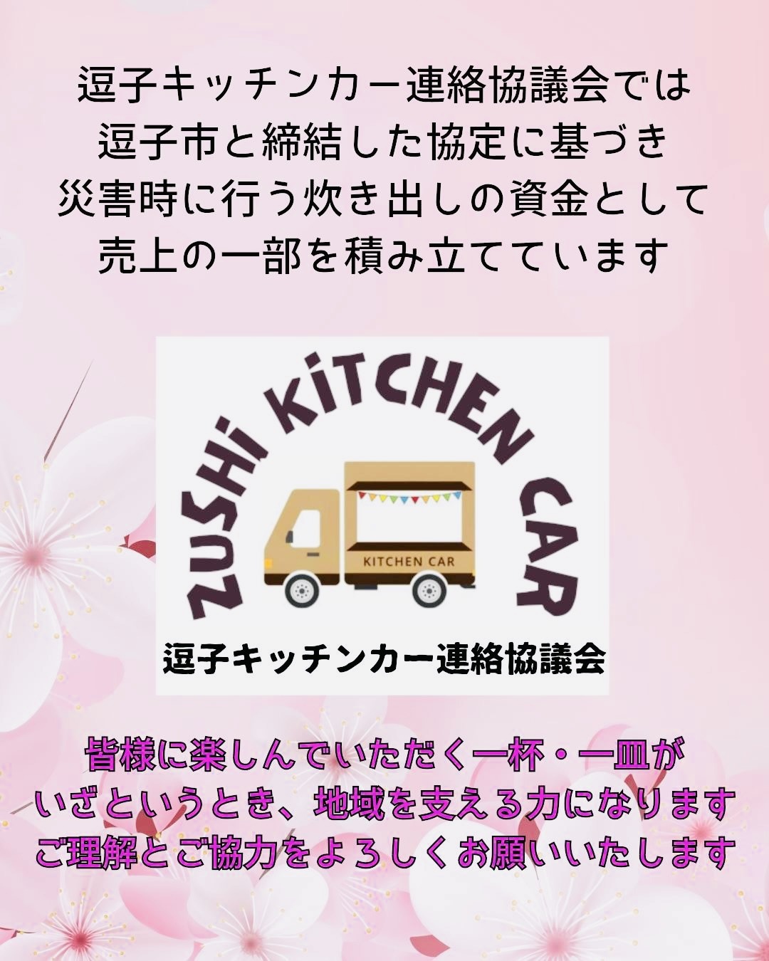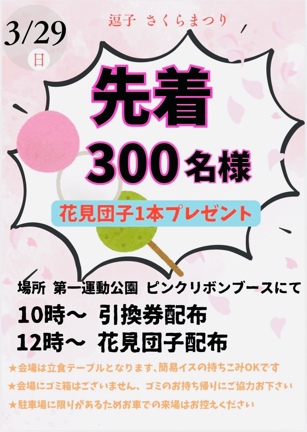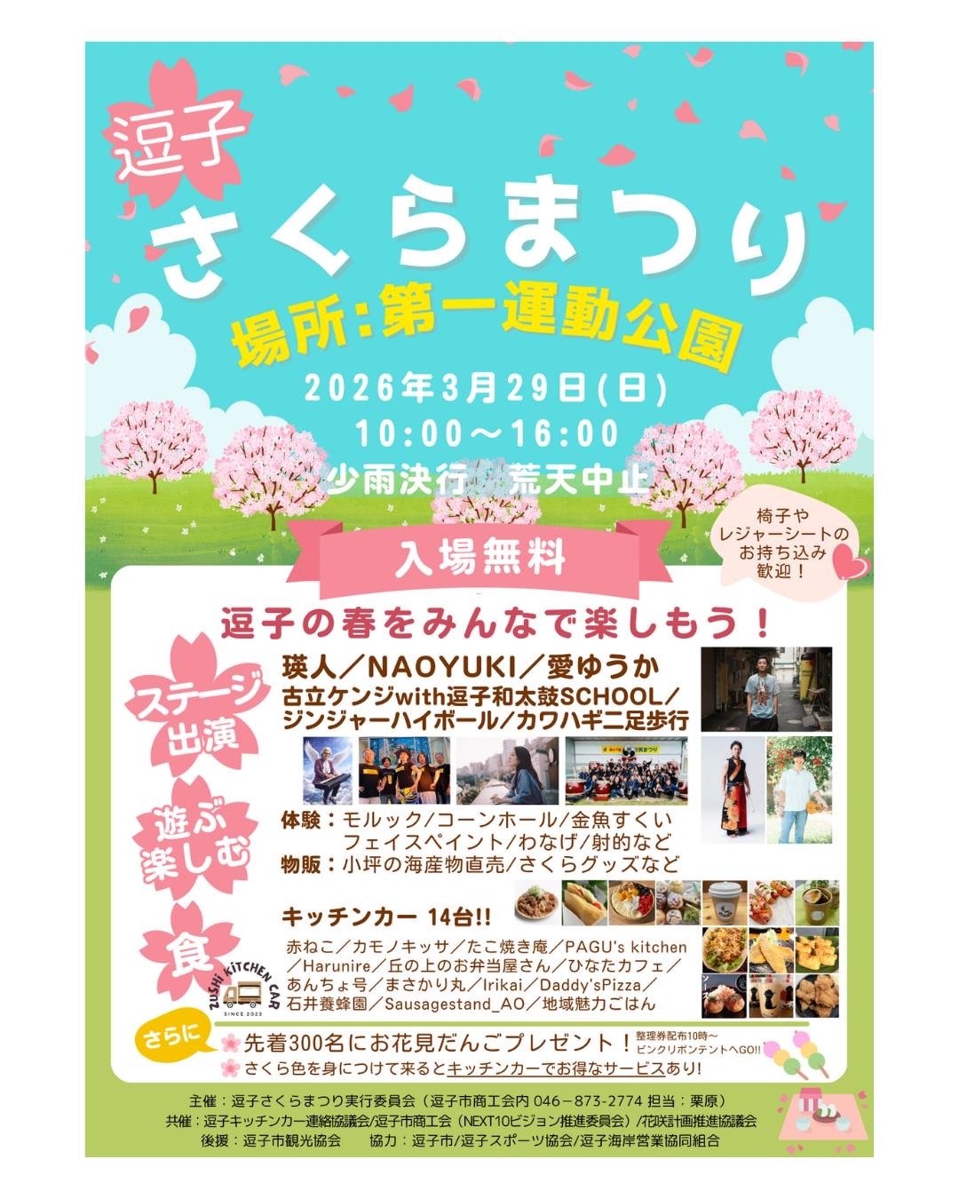 逗子さくらまつり 2026年3月29日(日)開催します! 日時:2026年3月29日(日)10:00~16:00 場所:第一運動公園 春を感じる逗子風物詩イベント! 今年はキッチンカーが14台! ステージに盛り上がり、キッチンカーで美味しい食べ物たべてスポーツ体験、等々楽しい一日を レジャーシート、イス持参で一日ゆっくり楽しみましょう! エリア 池子 カテゴリー 海・公園・レジャー イベント フォトジェニック 子供と一緒 カップルおすすめ 祭り Loading... 基本情報 住所 神奈川県逗子市池子1-275-1 お問い合わせ先 逗子さくらまつり実行委員会 電話番号 046-873-2774 開催場所 第一運動公園 開催期間 2026年3月29日(日)10:00~16:00