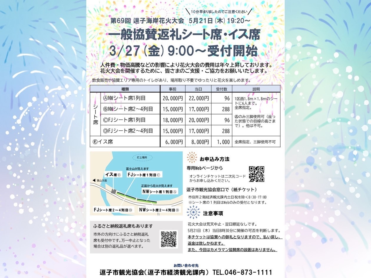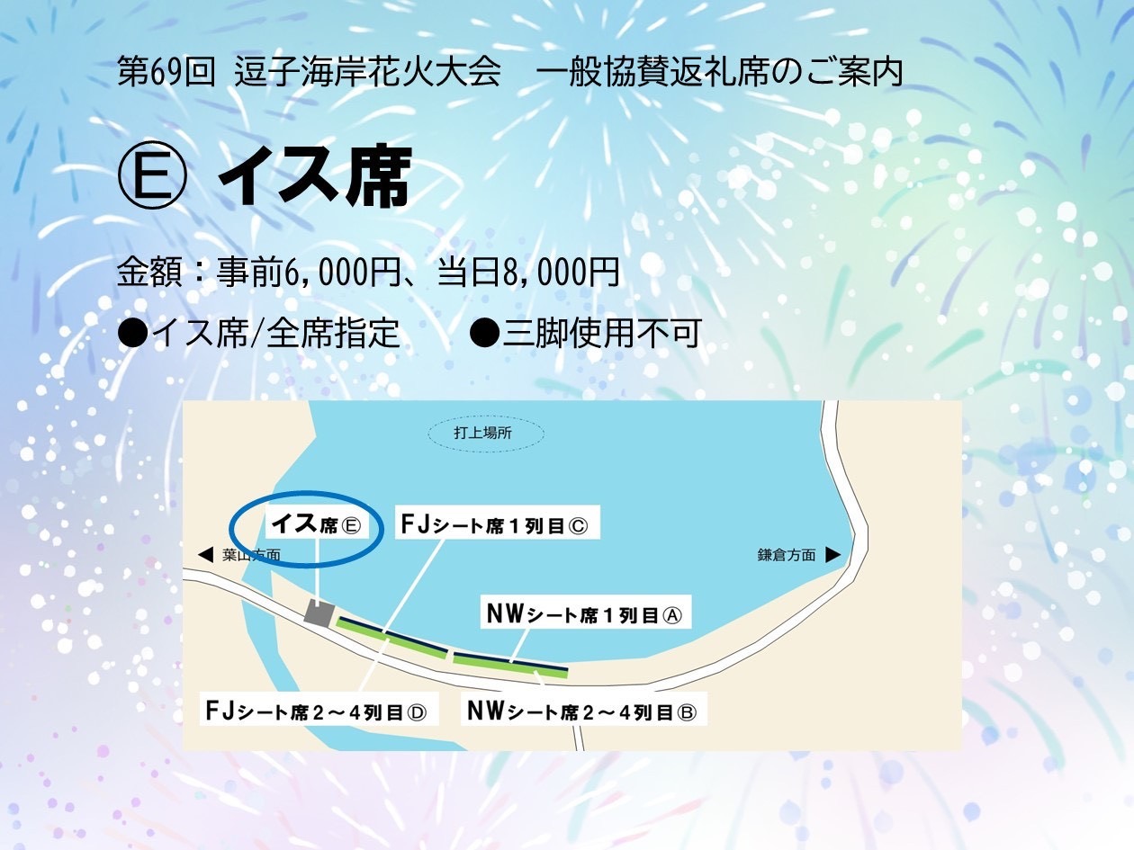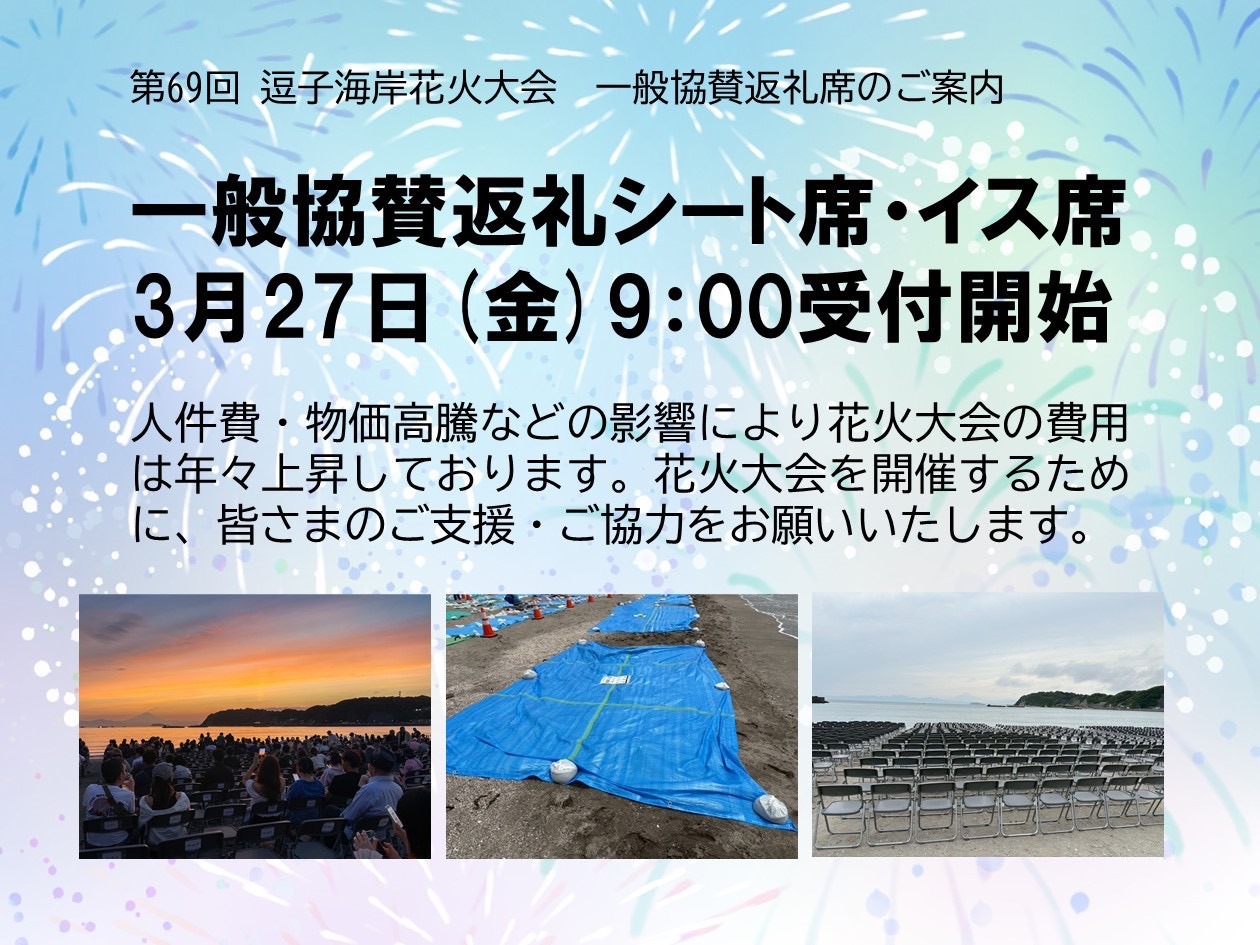 第69回逗子海岸花火大会一般協賛返礼シート席・イス席受付 第69回逗子海岸花火大会一般協賛返礼シート席・イス席受付 場所取り不要で飲食販売や専用トイレも完備!ゆったりと花火を楽しめる特別な席です! Loading... 基本情報 住所 神奈川県 お問い合わせ先 逗子市観光協会 電話番号 046-873-1111(286)