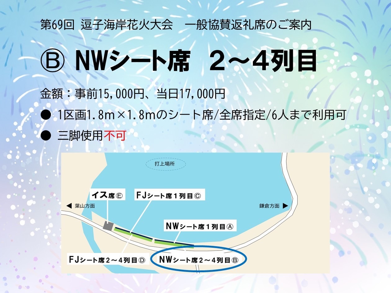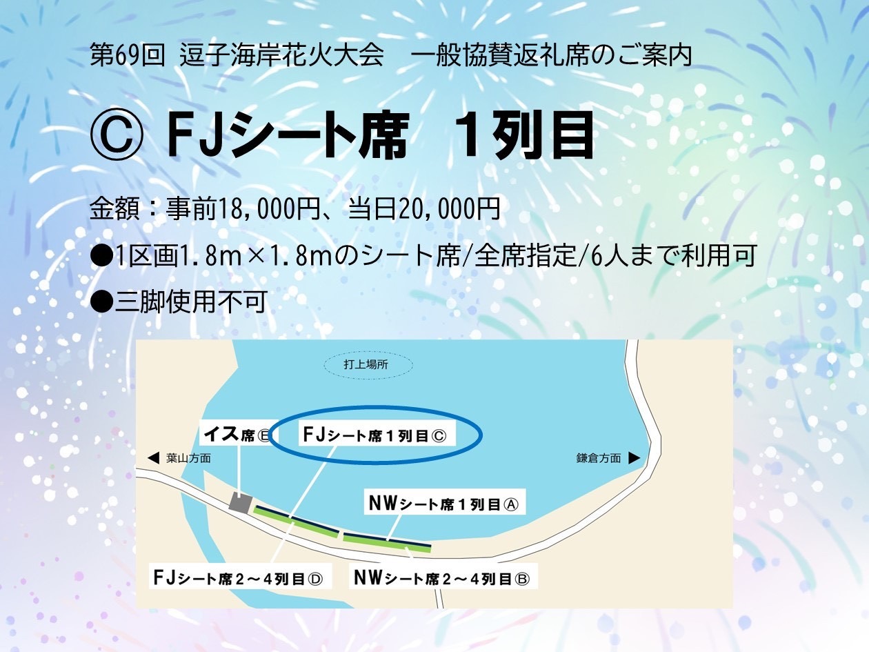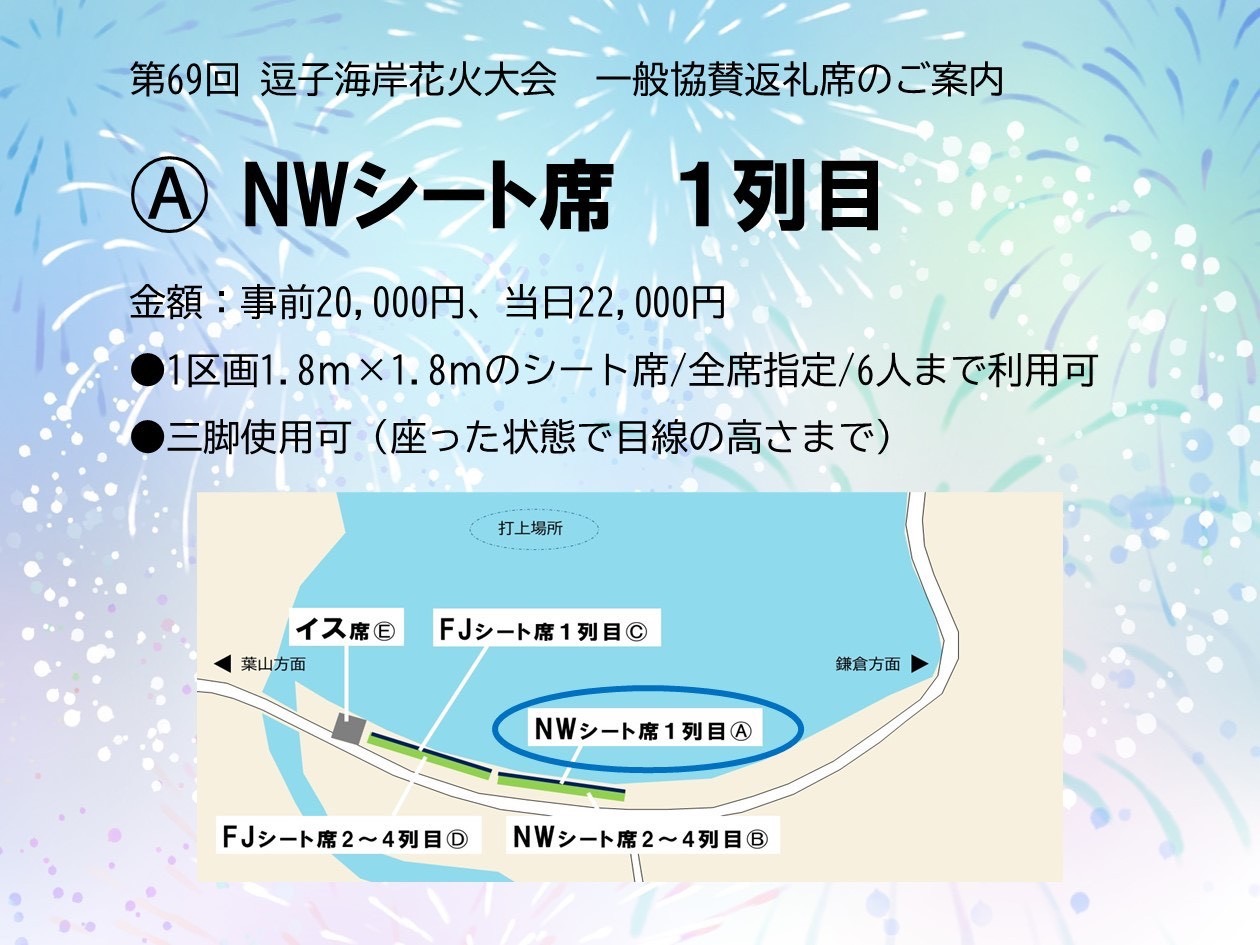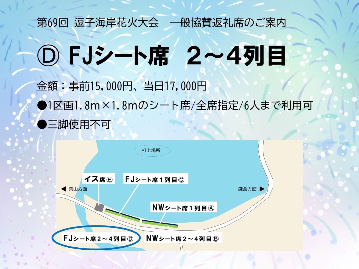 第69回逗子海岸花火大会一般協賛返礼シート席・イス席受付 第69回逗子海岸花火大会一般協賛返礼シート席・イス席受付 場所取り不要で飲食販売や専用トイレも完備!ゆったりと花火を楽しめる特別な席です! Loading... 基本情報 住所 神奈川県 お問い合わせ先 逗子市観光協会 電話番号 046-873-1111(286)