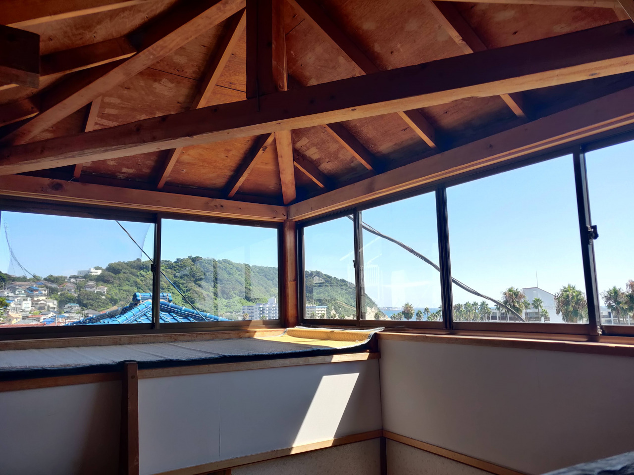 2階建てロフトつきの一軒家。8名様まで宿泊可能です。昭和レトロな雰囲気があふれるリビングやダイニング。ロフトからは山、海、お天気がよければ富士山も見ることができます。逗子の海が眺められるロフトはお子さんに大人気です。